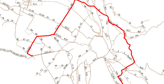 Jede Geometrie stellt den mit dem Fahrplan korrelierten Fahrtverlauf von einer oder mehreren Buslinien dar. Anfragen der Form "welchen Fahrtweg nimmt die Buslinie 2, die am 22.8. um 19:20 an Station X startet?" sind problemlos zu beantworten.